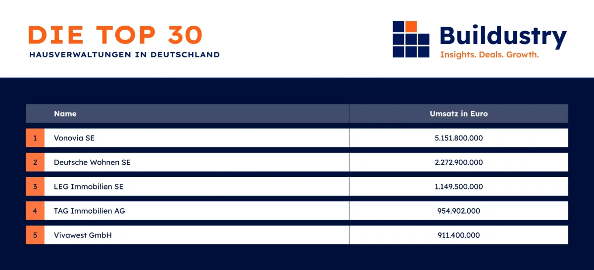 Das Ranking der größten Hausverwaltungen in Deutschland führt die Vonovia SE mit einem Umsatz von 5,15 Mrd. Euro an. Zum Bestand der Vonovia SE mit Sitz in Bochum gehören 549.000 Wohnungen an rund 400 Standorten in Deutschland. Das Kerngeschäft des Unternehmens besteht aus dem Erwerb, der Veräußerung und der Verwaltung von Wohnungen. Derzeit beschäftigt Vonovia mehr als 10.000 Mitarbeitende.