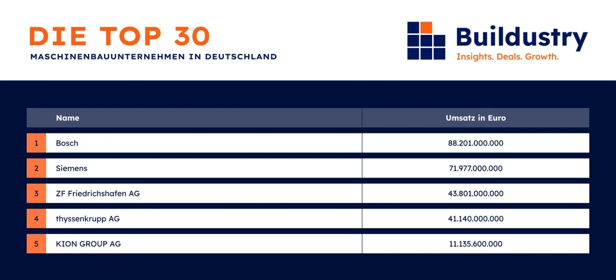 Das Ranking der größten Maschinenbauunternehmen in Deutschland führt Bosch mit einem Umsatz von 88,2 Mrd. Euro an. Die Bosch Gruppe ist ein internationales Technologie- und Dienstleistungsunternehmen mit Sitz in Baden-Württemberg. Neben der Robert Bosch GmbH umfasst die Bosch-Gruppe rund 440 Tochter- und Regionalgesellschaften in rund 60 Ländern. Das Produktportfolio der Gruppe gliedert sich in die Bereiche Mobilität, Industrie und Handwerk. So ist Bosch international als Automobilzulieferer und Hersteller von Industrie-, Energie- und Gebäudetechnik (Elektrowerkzeuge, Thermotechnik, Sicherheitssysteme) sowie von Haushaltsgeräten tätig.